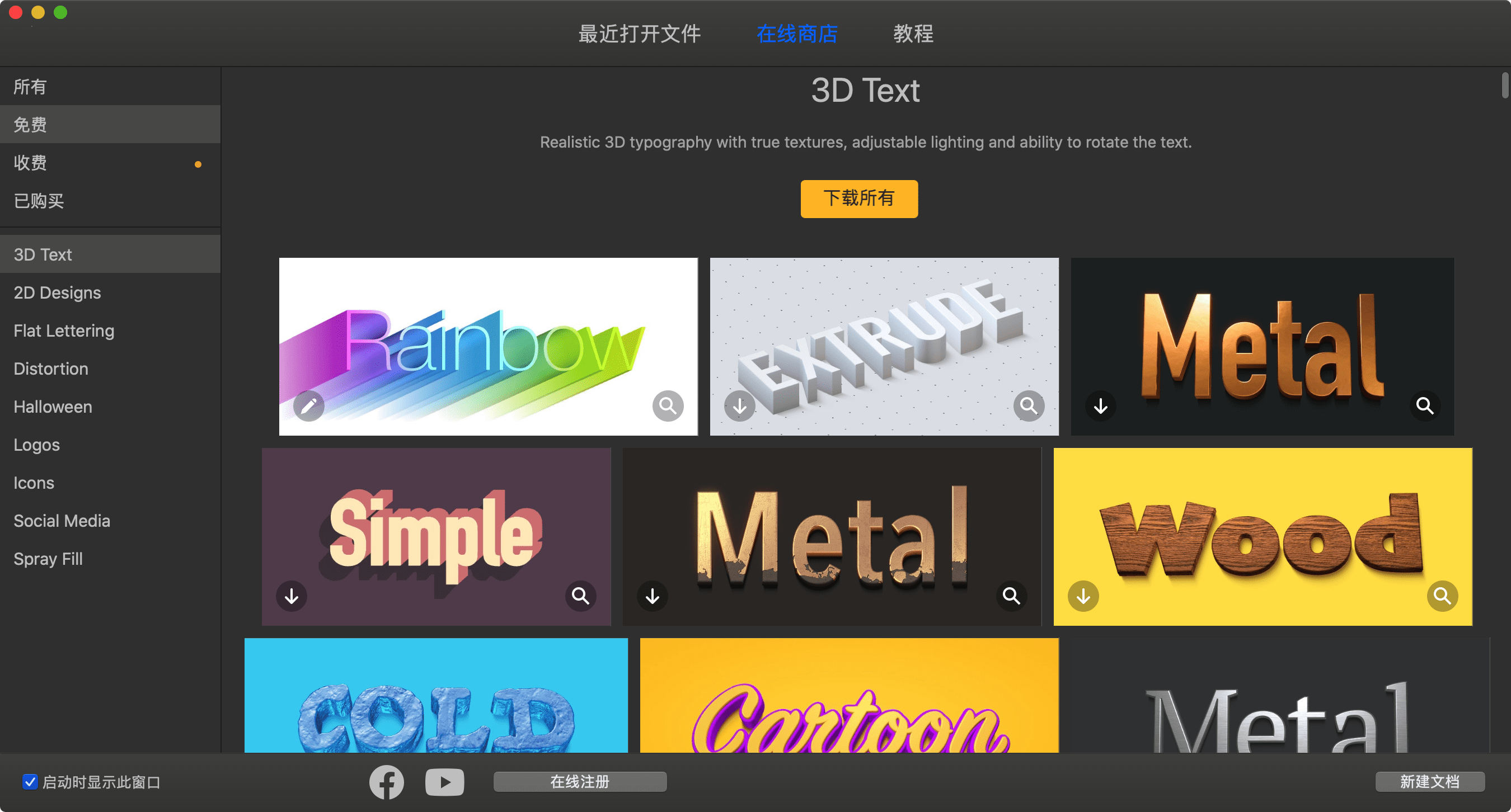 Art Text是一款Mac上的图标和文字设计制作软件,这款软件内置了大量的背景纹理和特效,并可以生成艺术2D、3D文字,制伏Logo和icon图标等,它能够让我们非常快速的制作出漂亮的图标,相比专业的PS,Art Text可以说是「傻瓜式」操作,无需学习即可上手,只需要简单的几步就可以制作出专业的PS需要复杂的操作才能生成的效果!支持多图层,制造复杂图形变得不费力。